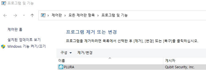 제어판 > 프로그램 > 프로그램 및 기능 > 프로그램 제거 또는 변경