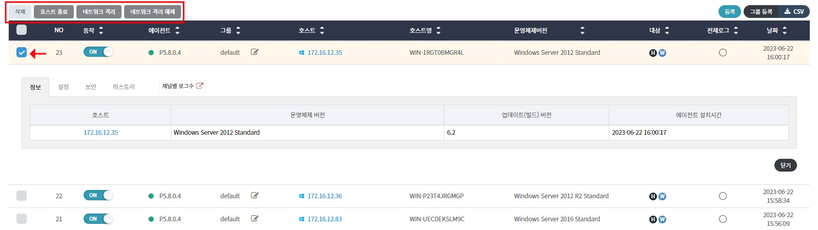 삭제할 호스트를 선택한 후 상단의 삭제 메뉴를 클릭합니다.